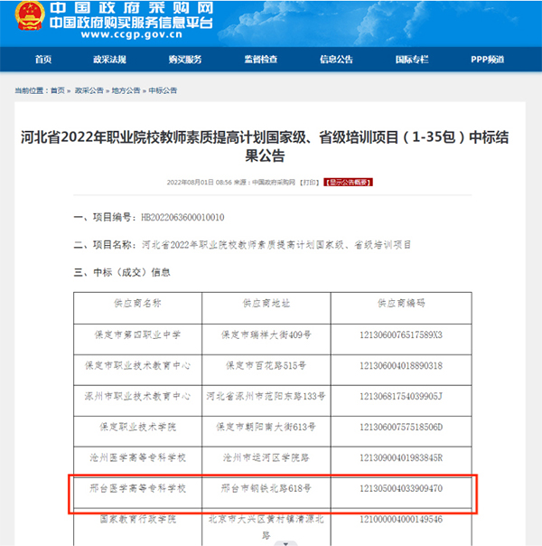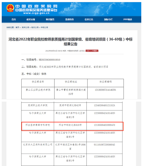 近日,中国政府采购网公布了河北省2022年职业院校教师素质提高计划国家级、省级培训项目中标结果,beat365官网申报的大学生心理健康指导教师培训、职业学校学生心理疏导与心理危机干预专题培训、技能大赛指导教师课赛融合与技能训练培训(医药卫生大类)、产业导师特聘和教师企业实践5个项目成功获批,计划培训245人,累计项目资金99.8万元,项目数和项目资金均创历史新高。