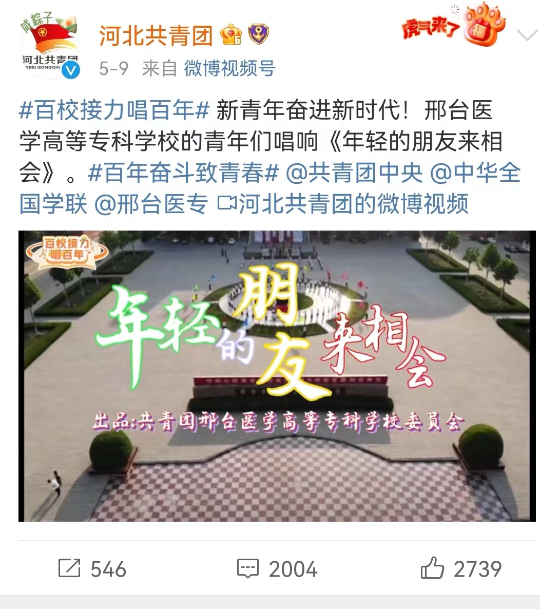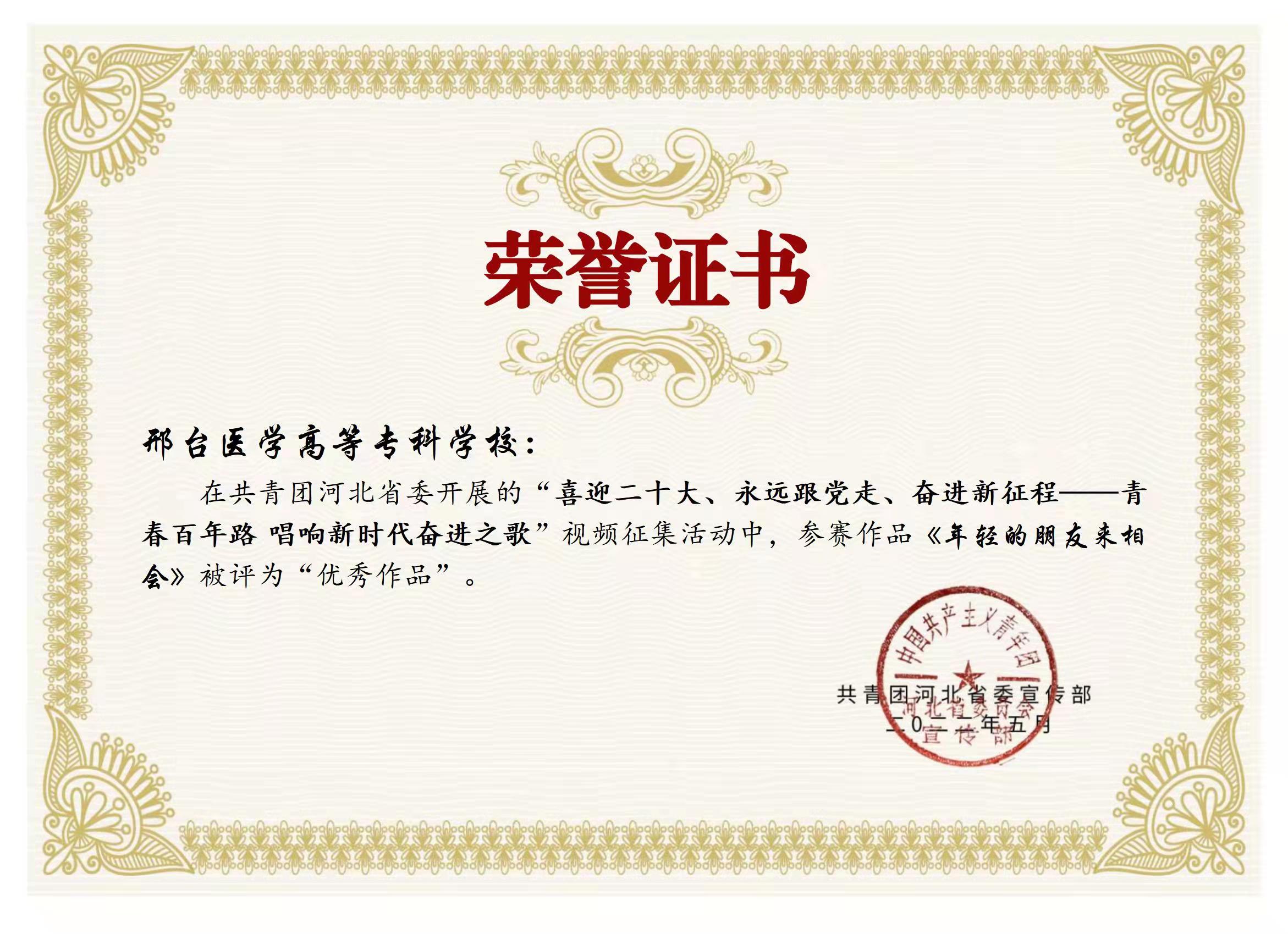 在庆祝中国共青团成立100周年之际,团省委发起了“喜迎二十大、永远跟党走、奋进新征程——青春百年路 唱响新时代奋进之歌 ”百校接力唱百年活动,校团委高度重视,认真谋划,精心组织,制作了《年轻的朋友来相会》MV,该MV在河北共青团微博视频号发表,评论、转发和点赞5000余次,受到了广大网友好评。近日,评选结果揭晓,该作品被评为“优秀作品”,也是邢台市唯一获奖作品。