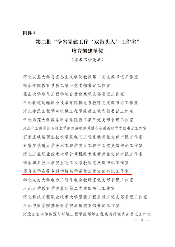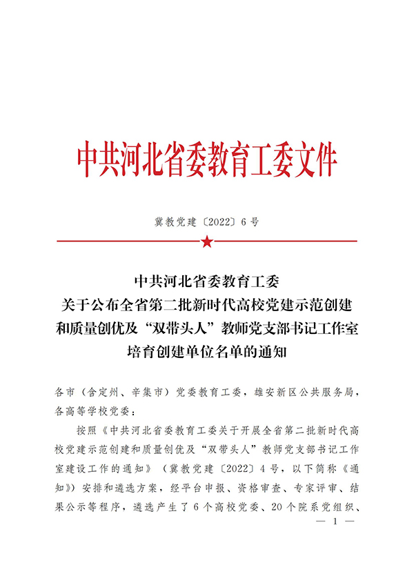 近日,中共河北省委教育工委印发《关于公布全省第二批新时代高校党建示范创建和质量创优及“双带头人”教师党支部书记工作室培育创建单位名单的通知》(冀教党建〔2022〕6号),对遴选产生的6个高校党委、20个院系党组织、30个党支部和30个“双带头人”教师党支部作为全省第二批党建工作示范高校、标杆院系、样板支部和“双带头人”教师党支部书记工作室培育创建单位予以公布,beat365官网药学系教工党支部书记工作室入选第二批全省高校 “双带头人”教师党支部书记工作室培育创建单位名单。