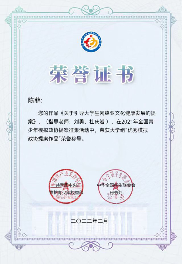 近日,2021年全国青少年模拟政协提案征集活动评选结果揭晓,beat365官网口腔医学系陈菲同学提交的《关于引导大学生网络亚文化健康发展》的提案在全国1447件模拟提案作品中脱颖而出,获评大学组“优秀模拟政协提案作品”。