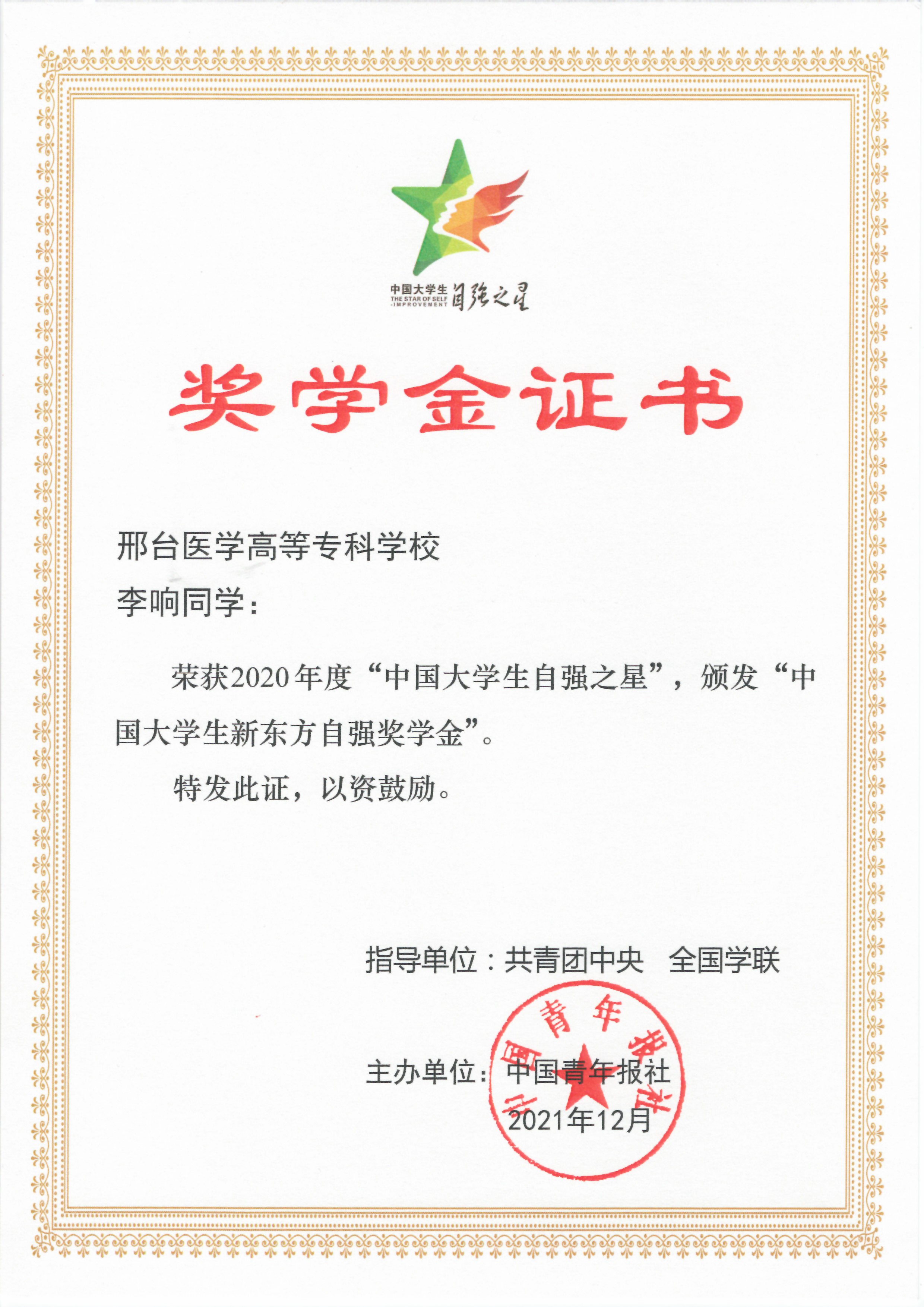 近日,由共青团中央、全国学联、中国青年报社、新东方教育科技集团联合开展的以“青春自强 奋勇争先”为主题的2020年度“中国大学生自强之星”活动获奖结果揭晓。beat365官网2019级药学系眼视光技术班的李响同学荣获“中国大学生自强之星”称号,并获得“中国大学生新东方自强奖学金”2000元。