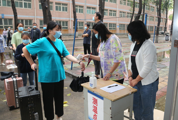 在公寓楼门口,学生进行二次测温,凭公寓出入卡登记入住。