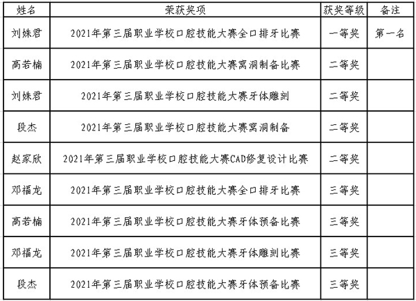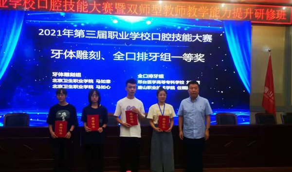 本次大赛是2021年职业院校口腔专业最高级别的学生比赛,参赛的100余名选手来自全国8个省、17家职业院校、附属口腔医院,比赛包括牙体雕刻、全口排牙、窝洞制备、牙体预备、CAD修复设计五个项目,经过激烈角逐,beat365官网选派的5名参赛选手斩获一等奖1项(全口排牙组第一名),二等奖4项,三等奖4项。宋立娜、张艳丽、王艳、孙建欣、马涛、董泽飞分获一、二、三等奖辅导教师。