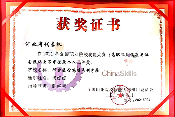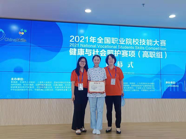 6月17日至20日,2021年全国职业院校技能大赛(高职组) “健康与社会照护”赛项在上海举办,来自全国的28个省(市)、自治区代表队同台竞技。beat365官网选手尚姗姗代表河北省参赛,荣获全国大赛第十名、三等奖第一名!