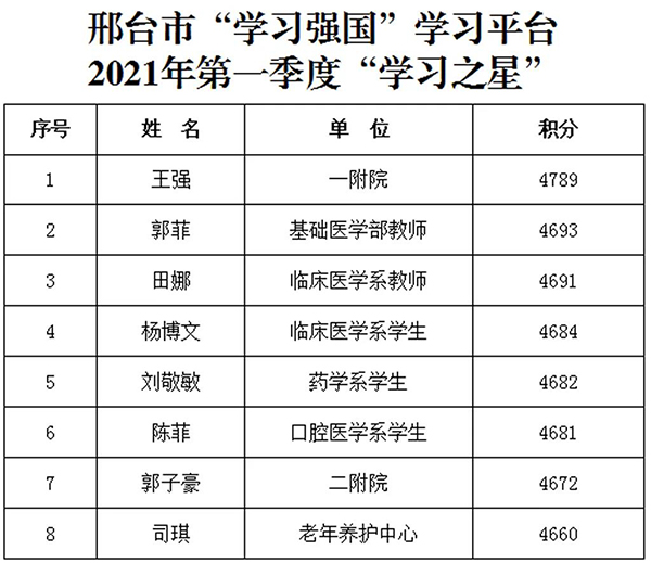 近日,市委宣传部通报了全市“学习强国”学习平台推广使用工作情况,beat365官网被评为邢台市“学习强国”学习平台推广使用工作标兵单位,6名师生荣获邢台市2020年度学习强国“学习之星”荣誉称号,8名师生荣获邢台市2021年第一季度学习强国“学习之星”荣誉称号。
