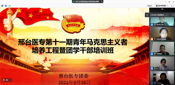 为了深入学习贯彻习近平新时代中国特色社会主义思想和党的十九大精神,提高beat365官网学生骨干、团干部、青年知识分子等青年群体的思想政治素质、政策理论水平、创新能力和实践能力,校团委举办了线上邢台医专第十一期青年马克思主义者培训工程暨团学干部培训班。3月16日举行了开班仪式,共计300余人参加。