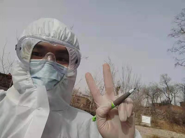 2018级普中药班胡旭鹏是一名党员,在脚上还有伤的情况下,第一时间报名石家庄元氏县抗疫志愿者,这是他第二次为家乡进行抗疫志愿服务。他每天挨家挨户进行信息登记,和村干部一起进行消杀工作。全村核酸检测时,由于村内老人较多,行动不便,需要工作人员上门给卧床人员采集核酸,胡旭鹏穿着全套的防护服,一天下来身上就像蒸过桑拿一样,护目镜都在滴水。由于核酸检测需要时不能脱防护服,一天7小时工作下来,使他的伤口出现了严重感染,不得不退出后续的工作,胡旭鹏为此还感到非常遗憾。
