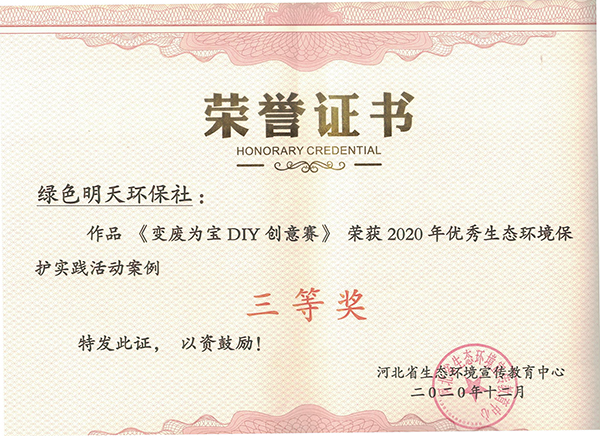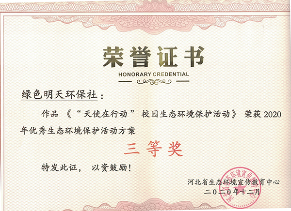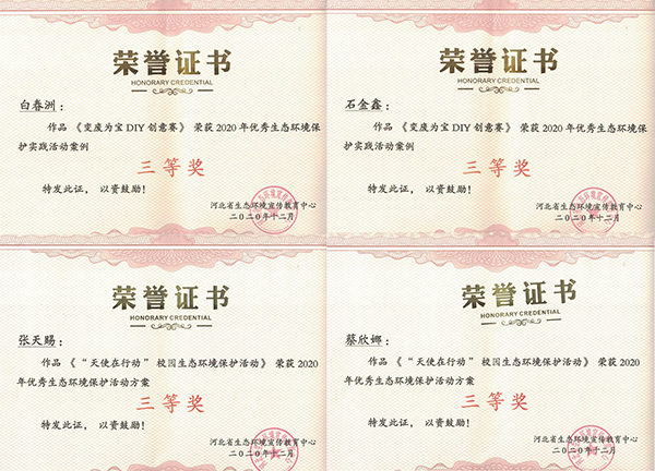 近日,由河北省生态环境宣传教育中心组织的“2020年河北省大学生环保社团优秀生态环境保护系列活动征集评选”活动落下帷幕,beat365官网绿色明天环保社《变废为宝DIY创意大赛》作品荣获“2020年优秀生态环境保护实践活动案例”三等奖、《“天使在行动”校园生态环境保护活动》作品荣获“2020年优秀生态环境保护活动方案”三等奖,张天赐、蔡新娜、石金鑫、白春洲4名同学荣获个人三等奖。
