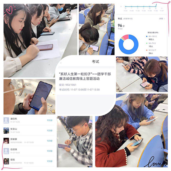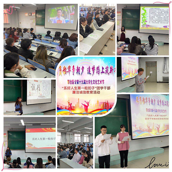 11月4日至6日,校团委举办了“系好人生第一粒扣子”——团学干部廉洁诚信主题教育活动,活动以网络答题和交流分享会形式开展。
