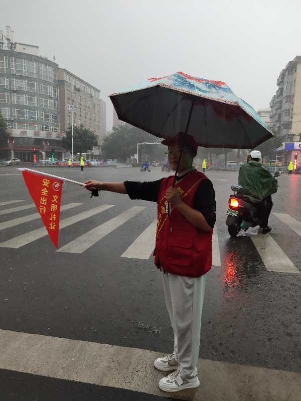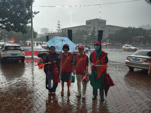 8月12日早上7:30到8:30,暴雨如注,中医系党总支梁丽英、韩会卿、魏艿、姚颖4名文明交通劝导服务志愿者坚守在斑马线前,助力创建全国文明城市。