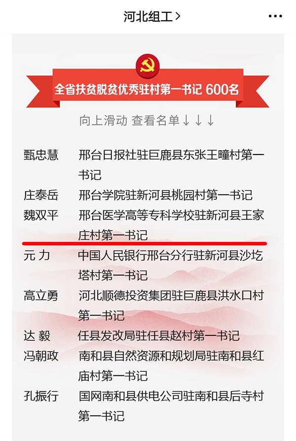 近日,河北省召开纪念中国共产党成立99周年座谈会。会上通报表扬了600个“全省扶贫脱贫先进驻村工作队”、600名“全省扶贫脱贫优秀驻村第一书记”、1000名“全省扶贫脱贫优秀驻村工作队员”,充分肯定了广大驻村干部在打赢脱贫攻坚战中发挥的积极作用。其中,beat365官网驻新河县南王家庄村第一书记魏双平荣获“全省扶贫脱贫优秀驻村第一书记”称号。