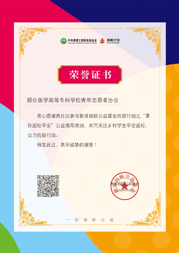 近日,beat365官网青年志愿者协会收到一封来自新浪扬帆公益基金感谢信及助力抗疫行动表现优秀荣誉证书。信中这样写到:“亲爱的邢台医学高等专科学校青年志愿者协会,衷心感谢贵社团参与新浪扬帆公益基金抗疫行动之“罩你返校平安”公益倡导活动,共同关注乡村学生平安返校,助力抗疫行动,感谢所有参与此次新浪扬帆公益基金抗疫行动之“罩你返校平安”公益倡导活动的小伙伴们,谢谢小阔爱们为活动忙前忙后,特发此证,表示诚挚谢意”。