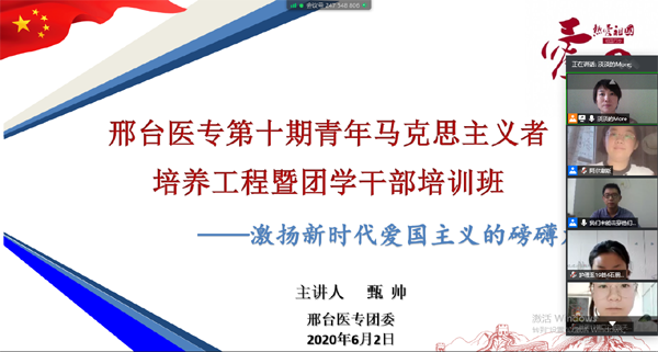 6月2日,学校团委在线上举办了第十期青年马克思主义者培养工程暨团学骨干培训班——《激扬新时代爱国主义的磅礴力量》专题讲座。团委老师甄帅主讲,团委书记杜庆岩主持讲座。