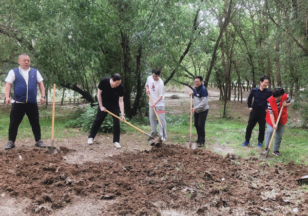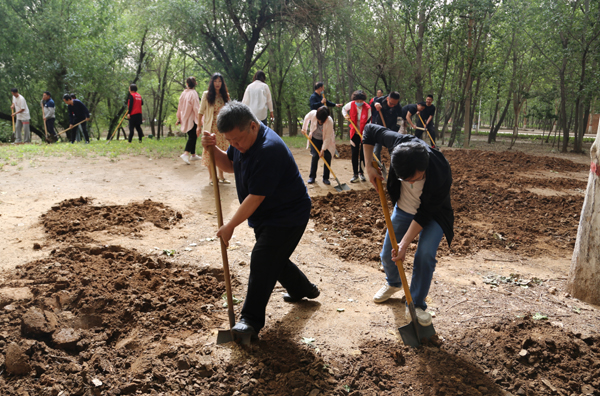活动当日,学校领导田德荣、郑书深、杜成旭带领大家手持铁锹、铁镐对天使湖周围、小树林进行环境清理、掘地松土。铁锹在握,锄头在手,有的掘地,有的松土,有的搬运翻出的石块、砖块,有的清理枯树、枯枝……大家干的如火如荼。在明媚的阳光下,大家汗流浃背,有的脱下外套,有的卷起衣袖,干劲十足。