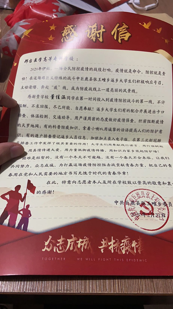 近日,beat365官网收到来自邢台市巨鹿县张王疃乡委员会的一封表扬信,赞扬了我系2017普护9班董佳涵同学在第一时间投入到乡村疫情防控战斗的工作中。