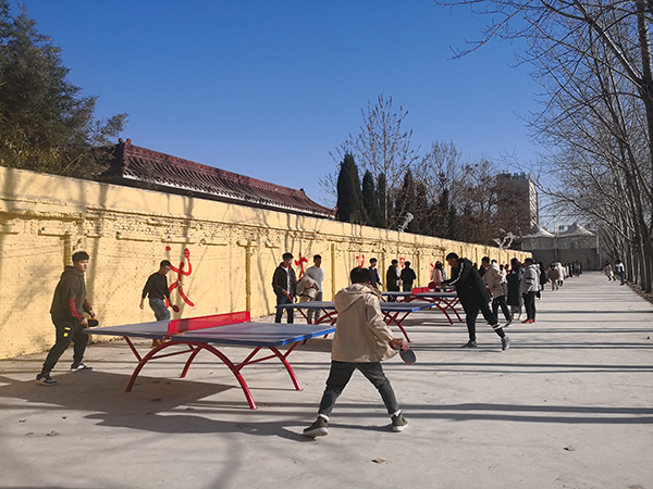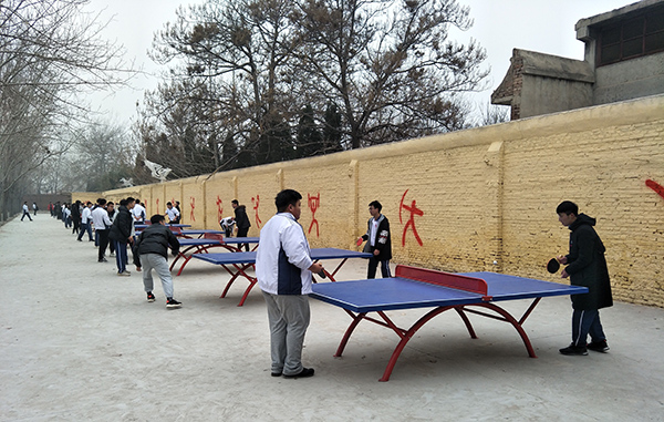 学校乒乓球运动场始建于2003年,原有乒乓球台是水泥的,因使用时间较长,地面陈旧破碎,旁边的围墙裸露着参差不齐的红砖,虽不断地进行修补,但从未彻底进行过改造。为更好地推动学校体育运动的开展,党委书记田德荣和党委副书记、校长郑书深多次到场地进行实地查看,现场研究解决问题,责成有关部门限期完成改造任务。学校购置了20个乒乓球台和3副篮球架投入使用,并对乒乓球场地和围墙进行了修整,场地面貌焕然一新,受到了广大师生的好评,成为了学校一道亮丽的风景线。