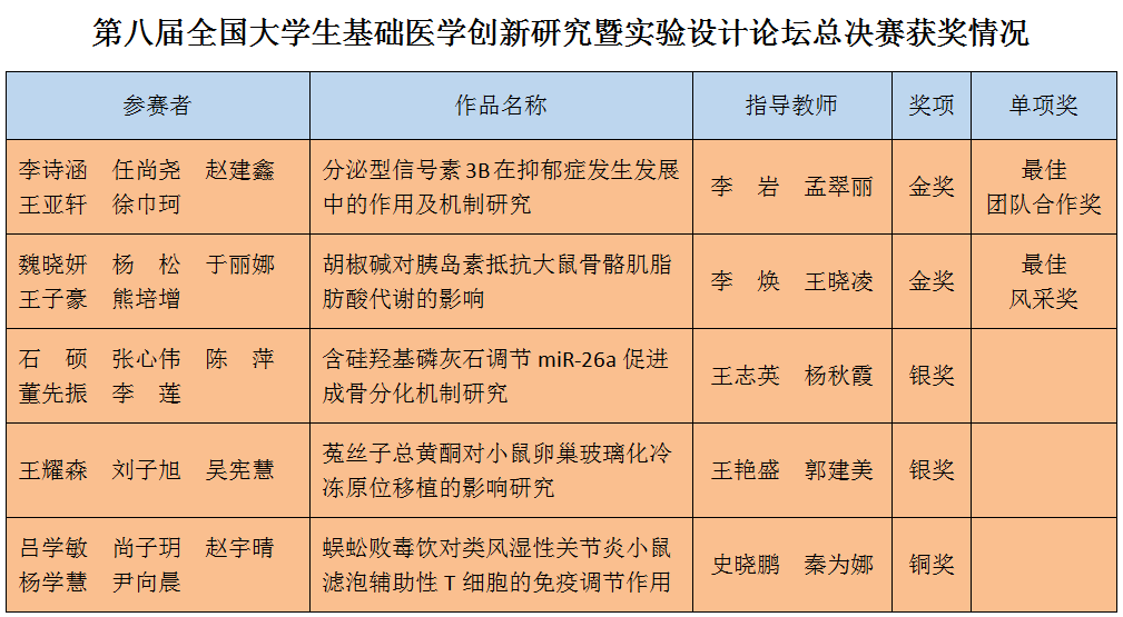 近日,由高等学校国家级实验教学示范中心主办、吉林大学承办的“第八届全国大学生基础医学创新研究暨实验设计论坛”总决赛在吉林长春举行。beat365官网5个参赛团队勇夺金奖2项、银奖2项,铜奖1项。其中,2个团队分别获得最佳风采奖和最佳团队合作奖,学校被评为赛事优秀组织奖。2021年,大赛开通了高职高专赛道,beat365官网5个参赛团队首战即斩获2金2银1铜,至今已连续2年位居金奖和奖牌总数全国第一。