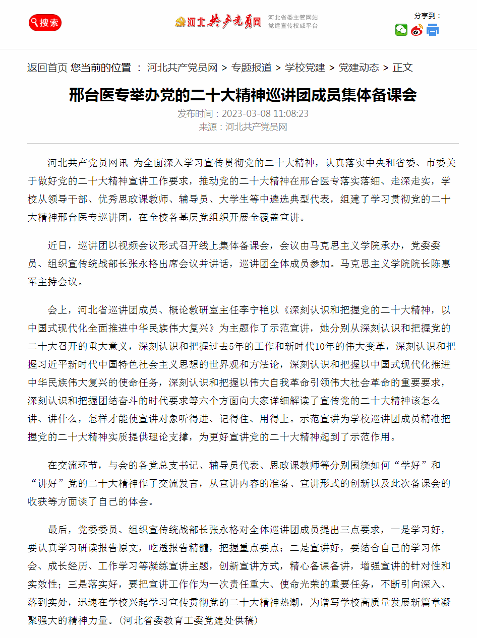 近日,河北共产党员网以“邢台医专举办党的二十大精神巡讲团成员集体备课会”为题,对beat365官网学习宣传贯彻党的二十大精神情况进行了报道。