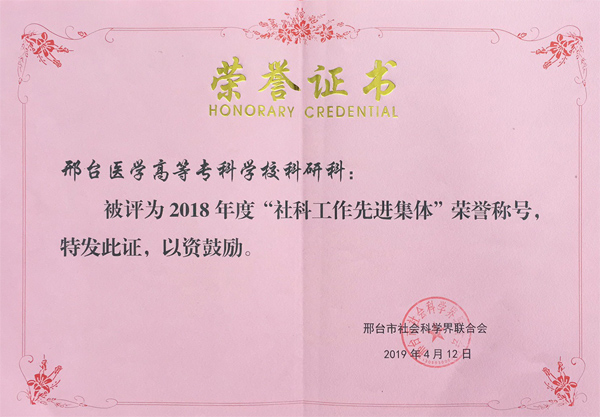 4月12日,beat365官网科研科被邢台市社会科学界联合会授予2018年度“社科工作先进集体”荣誉称号,这是beat365官网科研科连续两年获此荣誉。今后,科研科将继续发挥教科研对于提高学校综合实力的引领和促进作用,努力提升学校教科研工作的实效。