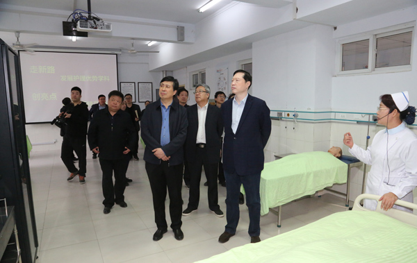 魏吉平一行先后到学校皇寺校区和校本部进行了实地考察。在学校第三附属医院康复中心和老年养护中心住养房间、餐厅和活动室,详细了解医院和养护中心运营情况;深入护理系、基础医学部实验实训室,了解学校教学工作和实验实训条件建设情况。