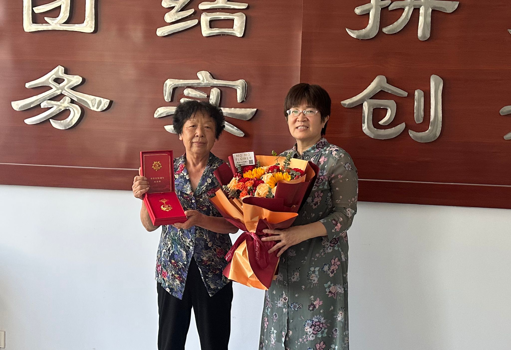 在学校办公楼三层会议室,学校党委副书记杜成旭,党委委员、组织宣传统战部部长张永格为赵志禄、郭风格、张荣梅等3名老党员颁发“光荣在党50年”纪念章,并送上鲜花,致以亲切的问候和崇高的敬意,感谢他们为学校事业发展作出的积极贡献。
