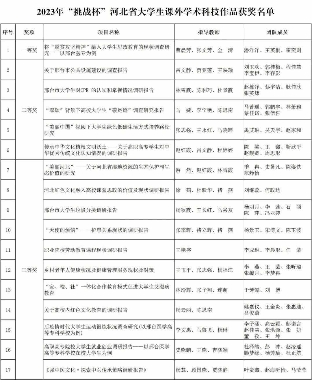 近日,由共青团河北省委联合河北省教育厅、河北省科学技术协会、河北省社会科学院、河北省学生联合会主办的2023年“挑战杯”河北省大学生课外学术科技作品竞赛成绩揭晓,beat365官网参赛项目荣获一等奖1项、二等奖5项、三等奖11项,学校荣获优秀组织奖,刷新了学校在此项赛事上的历史最好成绩。