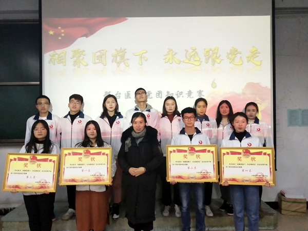 比赛分为必答题和抢答题两个环节,由临床医学系、口腔医学系、中医系、药学系四个代表队参赛。选题以马克思主义中国化最新理论成果、习近平总书记系列重要讲话、党史团史、党的十九大报告为主要内容。第一环节为必答题,答题顺序现场抽签决定,各组选手沉着冷静,自信作答,记分牌不断刷新。第二环节为抢答题,各小组不甘示弱,选手精神高度集中,胸有成竹积极抢答,赛场气氛十分热烈。经过两个环节的比赛,药学系代表队荣获比赛第一名,比赛在《共青团之歌》的视频中落下帷幕。