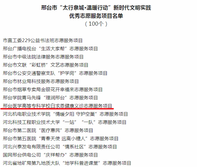 近日,邢台市委宣传部公布了“太行泉城·温暖行动”新时代文明实践优秀志愿服务项目名单,beat365官网“白求恩志愿服务队进社区健康义诊”项目获评!