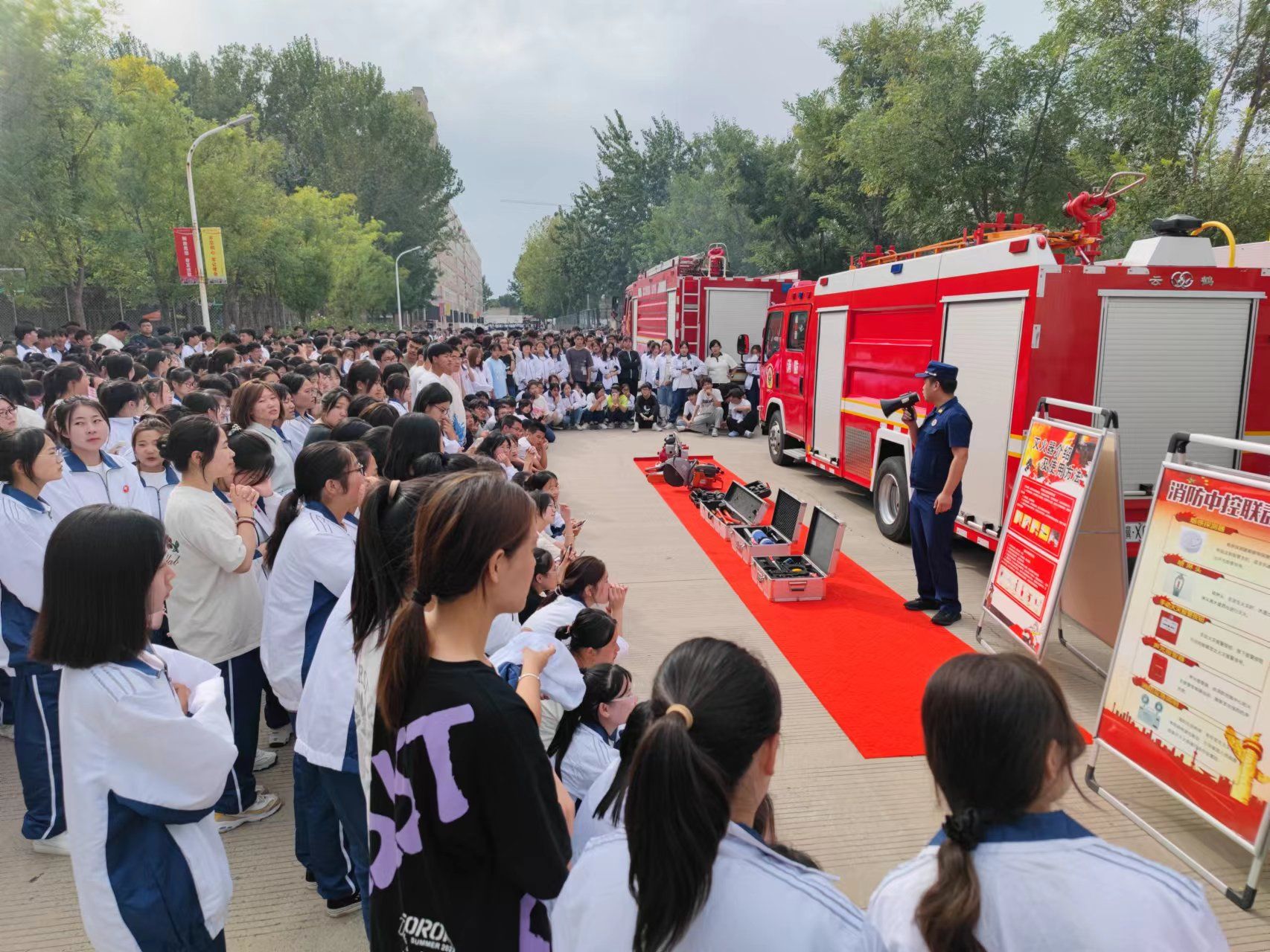 培训分为消防安全知识讲解、灭火器实操演练及辨识消防器材三个部分。首先,邢台市信都区泉北大街消防救援站梁站长分析了校园内易发生火灾的部位和原因,对如何消除火灾隐患和正确扑灭初期火灾进行了详细讲解。随后,他就干粉灭火器的正确使用方法进行了现场示范,并模拟常见火灾规模及类型,指导学生进行了现场灭火扑救演练。活动中,同学们还登上消防车,近距离参观了车辆器材装备,了解了各类抢险救援器材、灭火器材及消防车的用途、性能和使用情况。