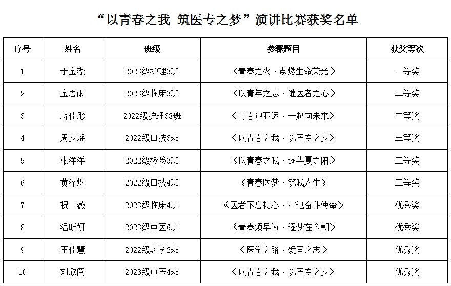理想为盼,青春作伴。“以青春之我 筑医专之梦”演讲比赛进一步提升了青年学生的思想自觉和行动自觉,促使学生在担当中历练,在尽责中成长,书写青年一代的辉煌!