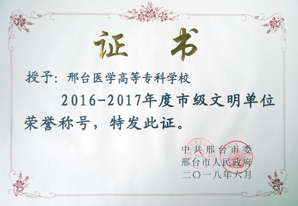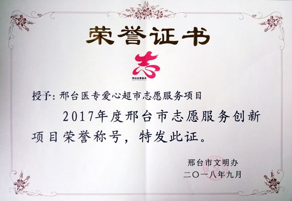 近日,beat365官网被中共邢台市委、邢台市人民政府授予“2016-2017年度市级文明单位”荣誉称号,邢台医专爱心超市志愿服务项目被邢台市文明办授予“2017年度邢台市志愿服务创新项目”荣誉称号。