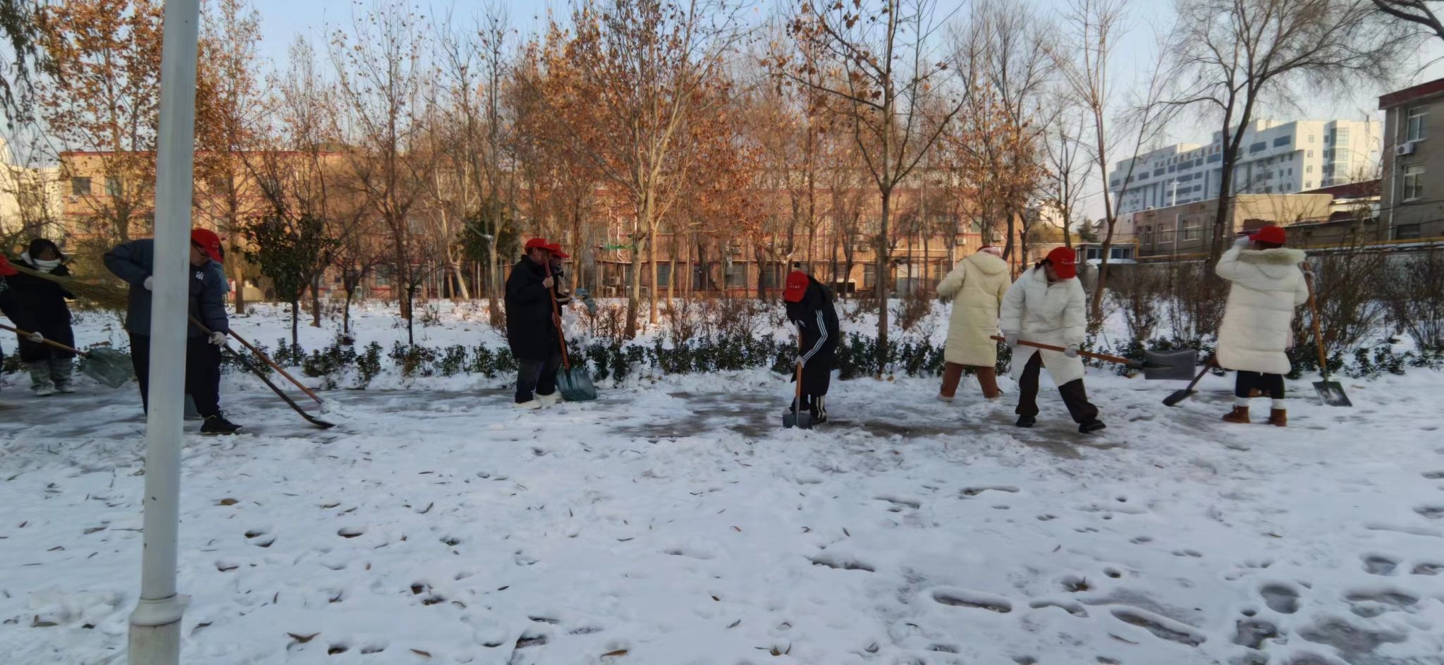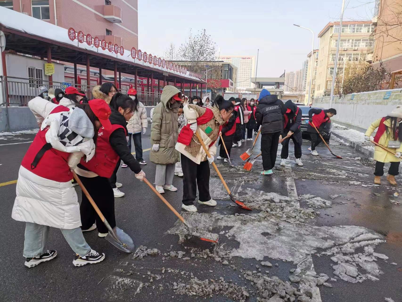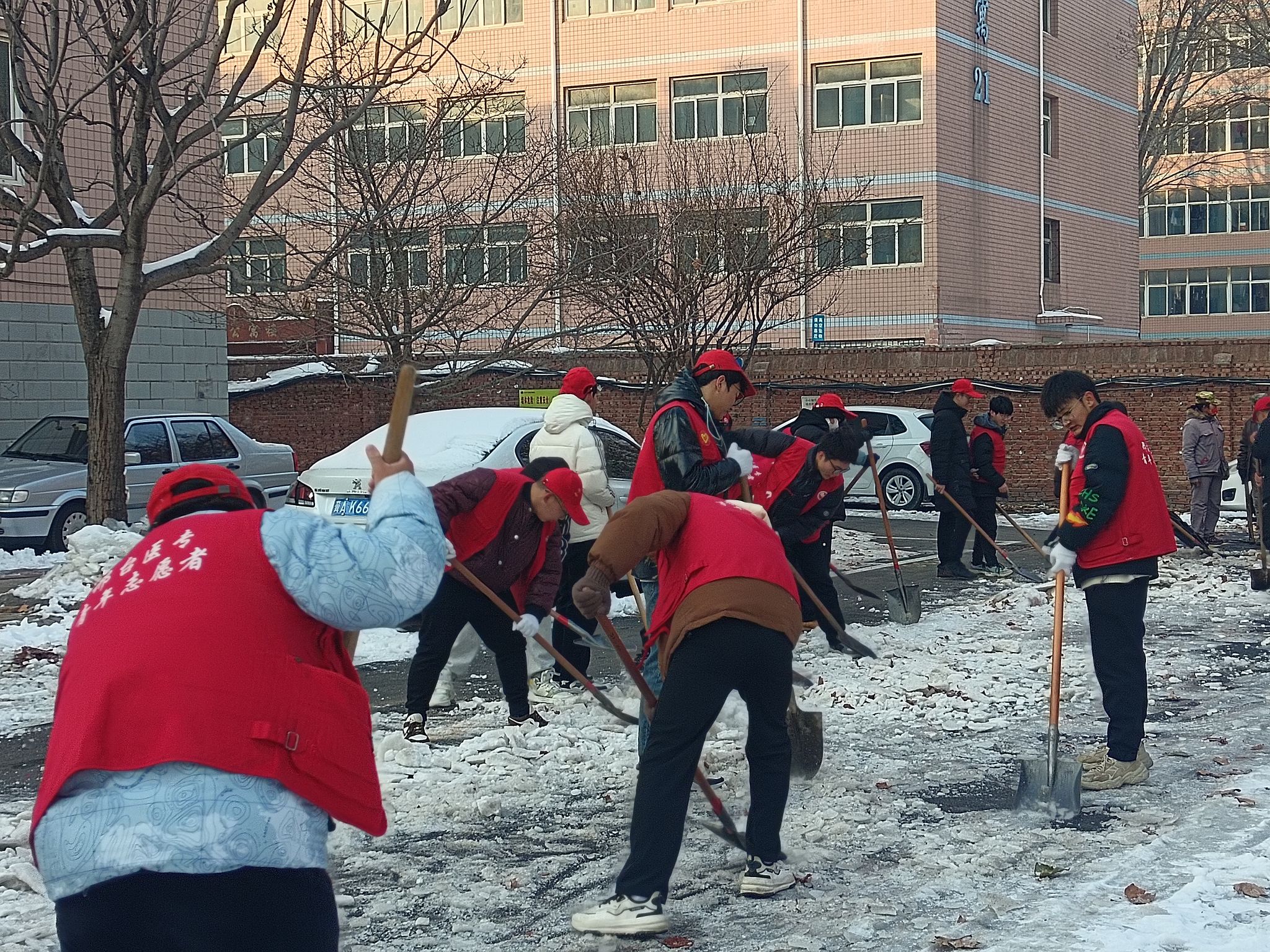志愿者们不顾地湿路滑和寒风凛冽,带着铁锹、扫把等工具来到活动地点,经过简单分工就开始了清雪行动,大家冒着零下十几度的严寒,不叫苦累,干得热火朝天,全力清除人行道、居民区的积雪寒冰,经过2个多小时的努力,结冰难行的道路变成了一条条洋溢着温情的安全之路。