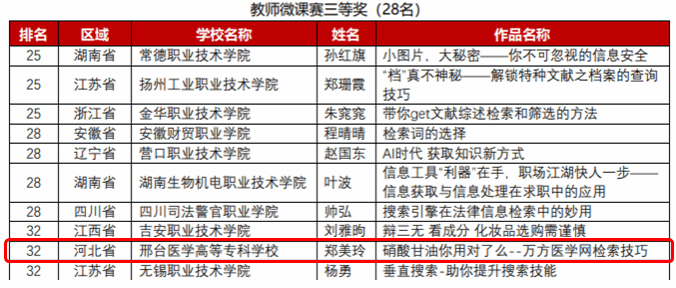在全国赛中,郑美玲老师的微课《硝酸甘油你用对了么-万方医学网检索技巧》斩获三等奖,图书馆馆长张艳华被评为“先进工作者”。