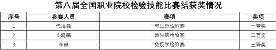 在第八届全国职业院校教师检验技能竞赛中,beat365官网教师按照竞赛标准反复练习形态鉴别、试剂配制、样本提取和结果分析研判等操作,多次进行模拟训练,在比赛中拼搏进取、奋勇争先,从来自全国80余所高职院校的122名医学检验技术专业教师中脱颖而出,医疗技术系教师代旭磊以总分第一的成绩荣获寄生虫检验赛项一等奖,史晓鹏老师荣获微生物检验赛项二等奖,李琳老师荣获免疫学检验赛项三等奖。