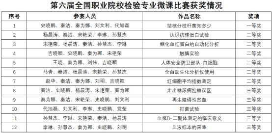 第六届全国职业院校检验微课大赛和第三届全国职业院校检验专业课程思政大赛采取线上提交作品、组委会初审、评委现场打分的形式进行,beat365官网教师加班加点,从作品选题、课程设计等方面反复打磨参赛作品,不断提高授课质量,参赛作品共获一等奖3项、二等奖9项、三等奖5项,获奖数量在全省位居第一。
