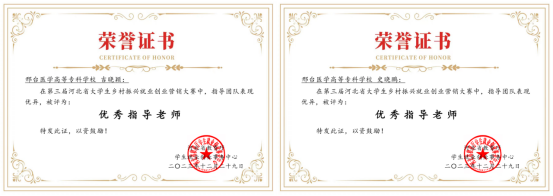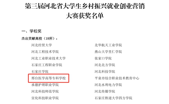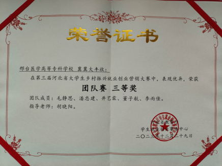 近日,beat365官网在第三届河北省大学生乡村振兴就业创业营销大赛中取得优异成绩,2022级药品经营与管理1班寇晨阳、刘冰、王芃飞、李可萌和2022级药品经营与管理2班刘佳获优秀个人奖;招生就业处教师胡晓阳指导的“冀冀大丰收”团队荣获团体三等奖,医疗技术系教师吉晓颖、史小鹏获优秀指导教师奖,学校荣获“杰出贡献高校”奖。