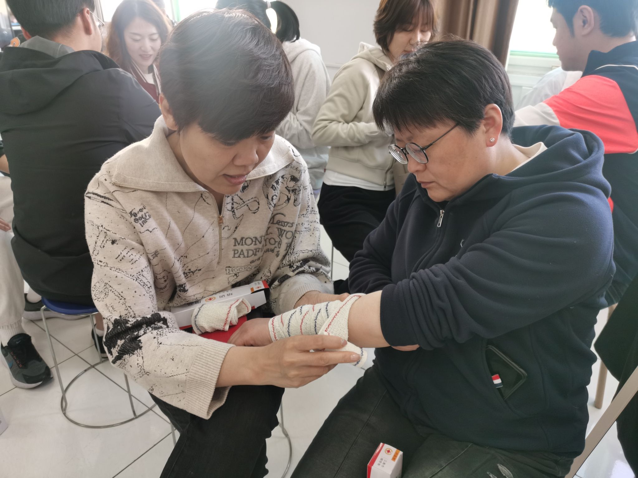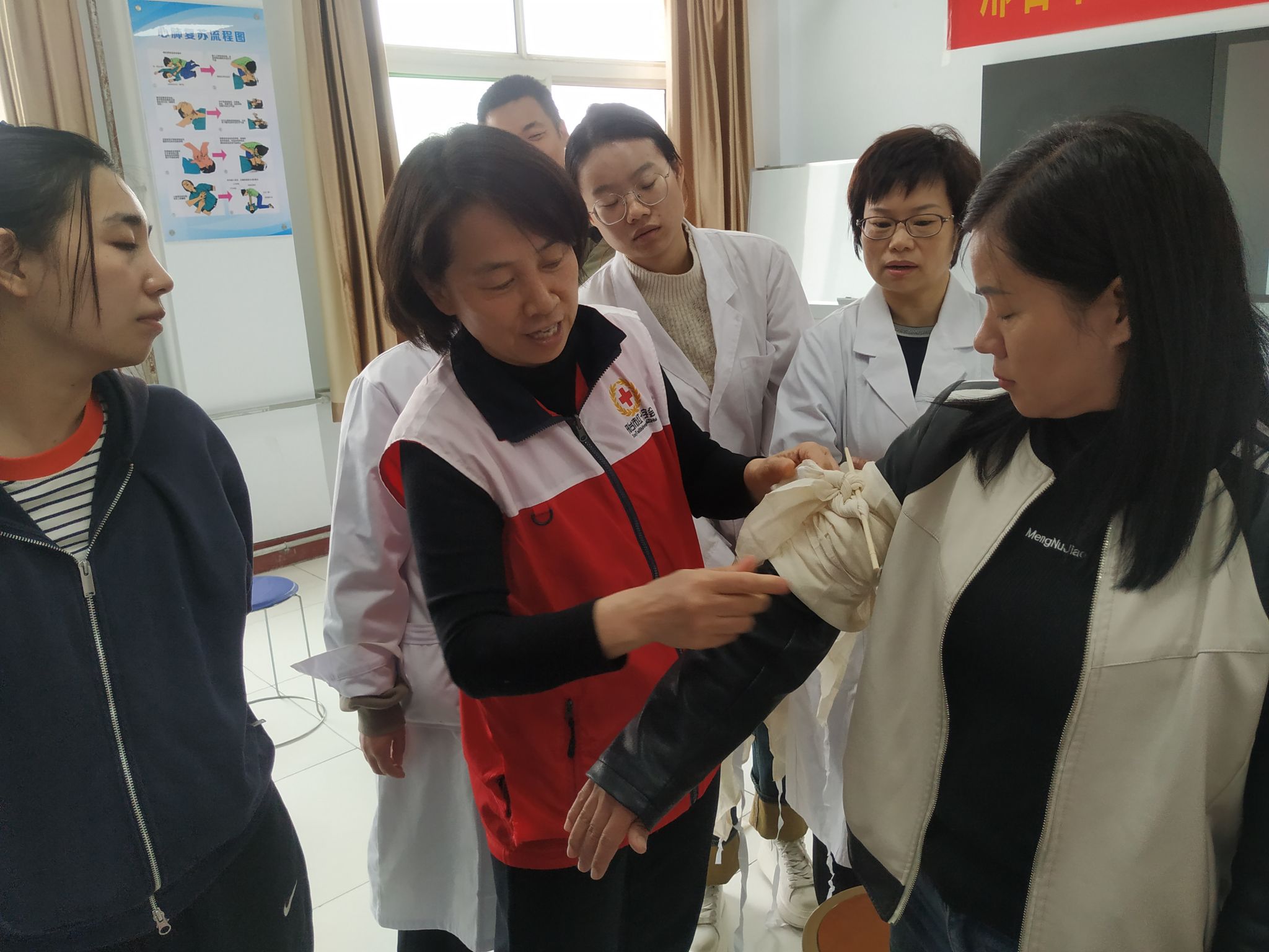 本次培训采用线上、线下相结合的形式。线上为理论知识讲授,主要讲解红十字会的起源、发展以及应急救护知识;线下为应急救护实操演练,包括心肺复苏、电除颤、止血包扎、气道异物梗阻处理等内容。beat365官网临床医学系李晓红、白志峰和顾国晓三位救护师凭借丰富的培训经验,耐心细致地讲解规范动作要领,手把手指导示范。老师们认真听讲、踊跃实操,学习热情高涨。