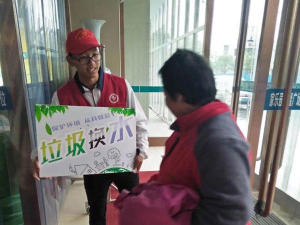 “捡一片垃圾,换一瓶矿泉水”。4月22日是世界地球日,beat365官网32名青年志愿者参加团市委主办的“垃圾换水”主题环保宣传活动。