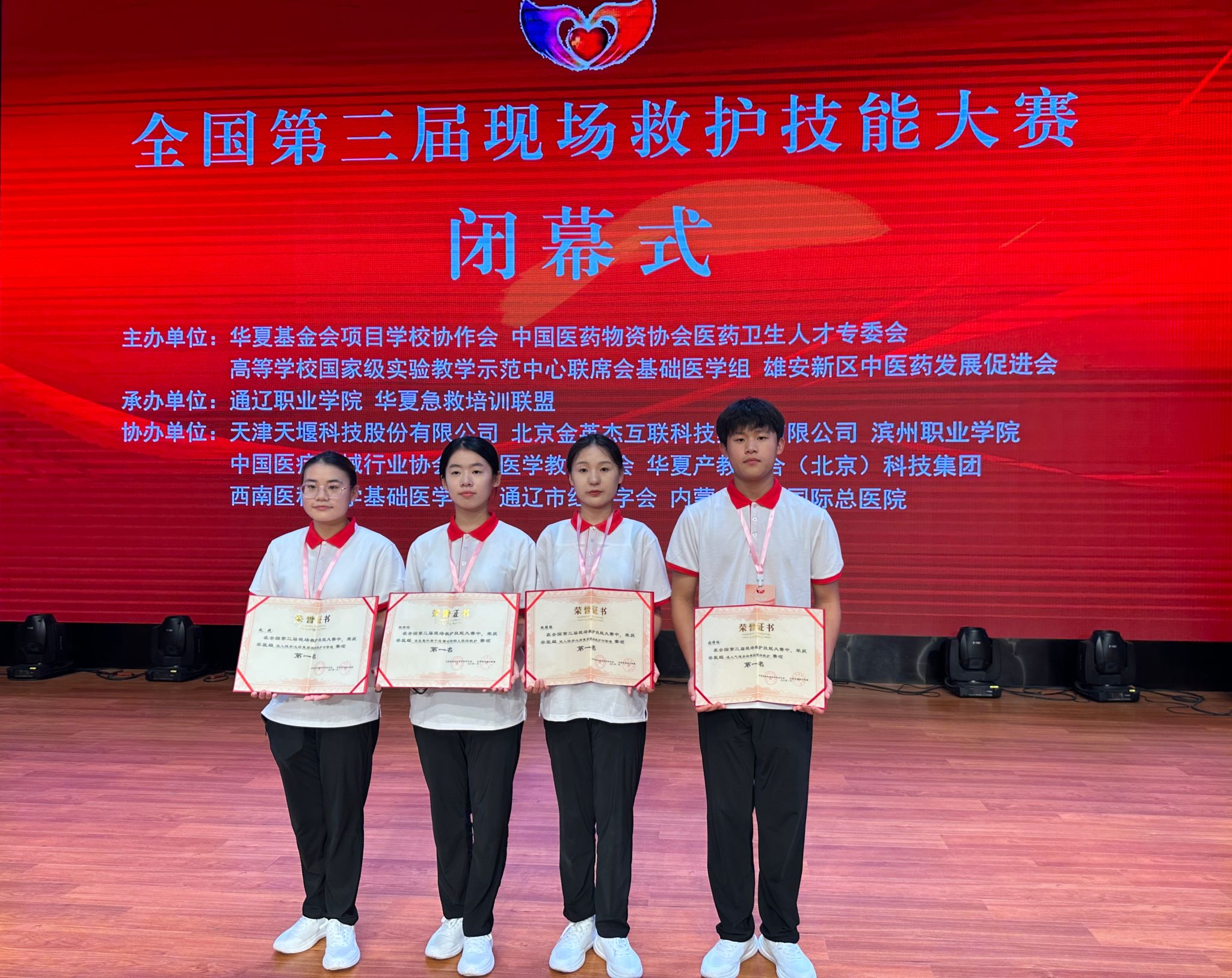 近日,beat365官网在中国医药物资协会医药卫生人才专委会、高等学校国家级实验教学示范中心联席会基础医学组等单位联合主办的“全国第三届现场救护技能大赛”中喜获佳绩。beat365官网赵聪聪和赵婕同学荣获非医学组双人徒手心肺复苏现场救护与管理赛项第一名,张梓楠同学荣获非医学组成人气道异物梗阻现场救护赛项第一名,田梁烁同学荣获非医学组突发意外单个危重创伤病人现场救护赛项第一名,孙丽娜老师和杨丽娟老师分别荣获团体第一名优秀指导教师,学校荣获非医学组团体第一名。