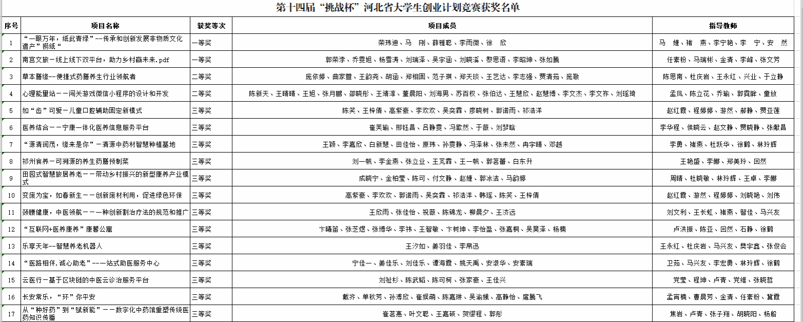 近日,共青团河北省委、省教育厅、省科学技术协会、省社会科学院、省学生联合会下发通知,公布第14届“挑战杯”河北省大学生创业计划竞赛作品获奖通报。beat365官网喜获17个奖项,其中一等奖2个、二等奖2个、三等奖13个,取得了beat365官网在该项赛事中的历史性突破,展现了beat365官网师生勇于挑战、敢于创新的精神风貌。