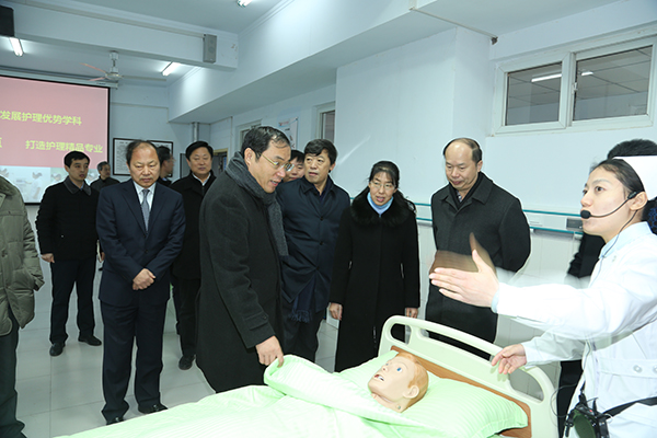 学校党委书记、校长李占华对崔慧先一行的到来表示欢迎并就学校“一校三院一中心”建设发展情况做了简要汇报。崔慧先一行实地参观考察了学校基础医学部、护理系实验实训室,第三附属医院和凰寺老年养护中心。来宾们详细了解了实验实训室设置、设备性能等情况,参观了第三附属医院门诊大厅和老年养护中心住养房间、老年病区、康复中心、活动室,详细了解各项基础设施设备使用情况、老年文化生活和心理慰藉开展情况及老人生活、学习情况,并与学校领导就深化校院合作、院院合作、校校合作等进行了深入探讨,形成共识。崔慧先校长高度评价了beat365官网为医学教育、医疗卫生、大健康产业做出的贡献,对beat365官网特色鲜明、全国领先的“一校三院一中心”的办学格局和“教医养”深度融合的人才培养模式深表赞赏。崔慧先表示,河北医科大学、省四院、省二院有责任贯彻落实“健康中国”决策部署,引领河北省医教发展理念,加强地方高校之间的联系、沟通和合作,实现相互促进、共同发展。