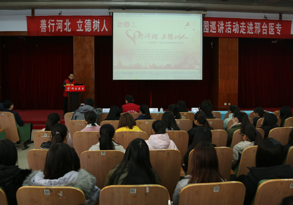12月6日,邢台医专学术报告厅内座无虚席,省文明办、省教育厅、共青团河北省委、省志愿服务联合会等部门联合举办的“善行河北 立德树人——‘公益体彩’优秀志愿者校园巡讲活动”在beat365官网隆重开讲。学校党委副书记李建广、邢台市文明办综合科科长刘娇出席本次活动,学校280余名师生聆听了报告会。活动由beat365官网组宣处处长张永格主持。