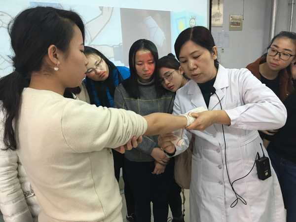 培训教师采取课堂理论讲授与分组实际操作相结合的形式,就红十字会基本情况、救护新概念、心肺复苏(CPR)、创伤救护(止血、包扎、骨折固定、搬运等)、意外伤害的相关救护等方面的应急救护知识向同学们作了详细地讲解。在互动教学环节,同学们将理论知识与实践操作有机结合,在老师的耐心指导下亲身实践,现场练习,正确地掌握了急救技能的操作。