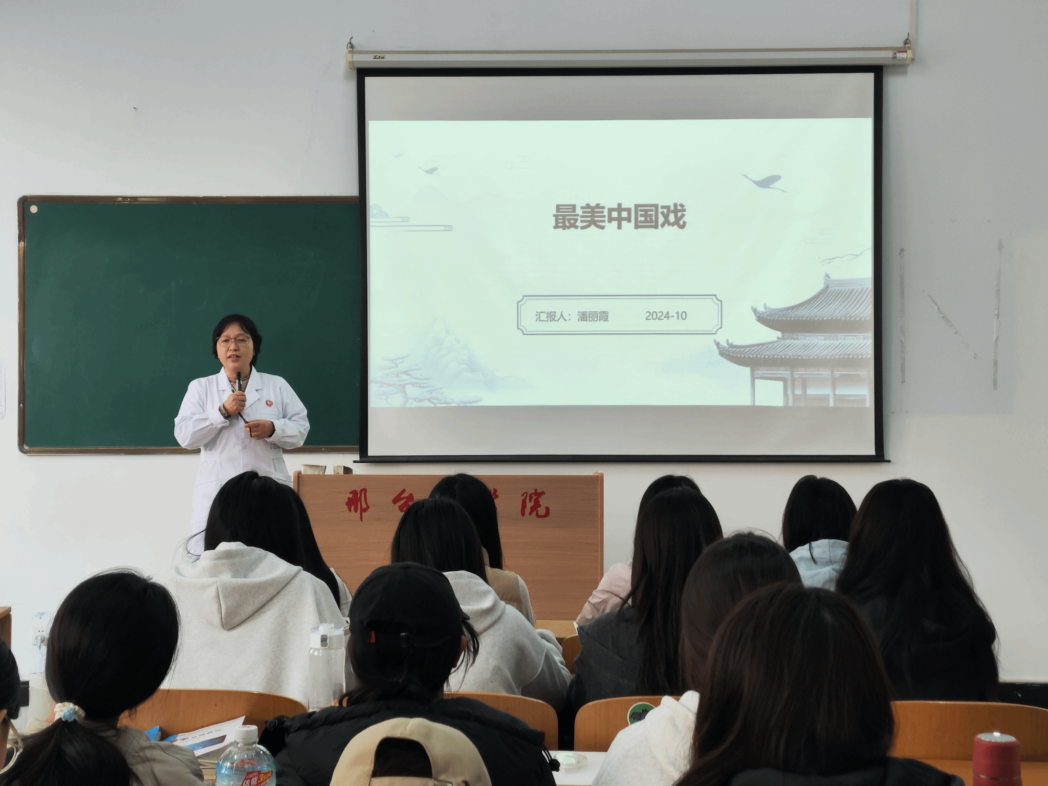 此次讲座由语文教研室潘丽霞老师主讲,她分享了戏曲的表演形式及艺术手法、音乐、造型、社会价值及影响等知识,并通过视频的形式进行了戏曲赏析。同学们认真聆听讲解,热情参与互动,气氛活跃热烈。