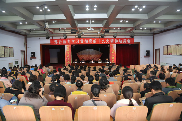 学校领导班子成员、全体党员、中层干部、政治辅导员、社科部教师、民主党派人士、附属医院主管领导及相关科室负责人共300余人参加会议。会上,学校党委副书记李建广传达了《中国共产党第十九次全国代表大会关于十八届中央委员会报告的决议》,党委委员、副校长杜成旭传达了《中国共产党第十九次全国代表大会关于<中国共产党章程(修正案)>的决议》,党委委员、副校长张志强传达了《中国共产党第十九次全国代表大会关于十八届中央纪律检查委员会工作报告的决议》,党委委员、副校长李朝鹏宣读了《中共邢台医学高等专科学校委员会学习宣传贯彻党的十九大精神实施方案》。党委书记、校长李占华作了题为《不忘初心,牢记使命,以十九大精神为引领,推进学校科学健康发展》的动员讲话暨辅导讲座。