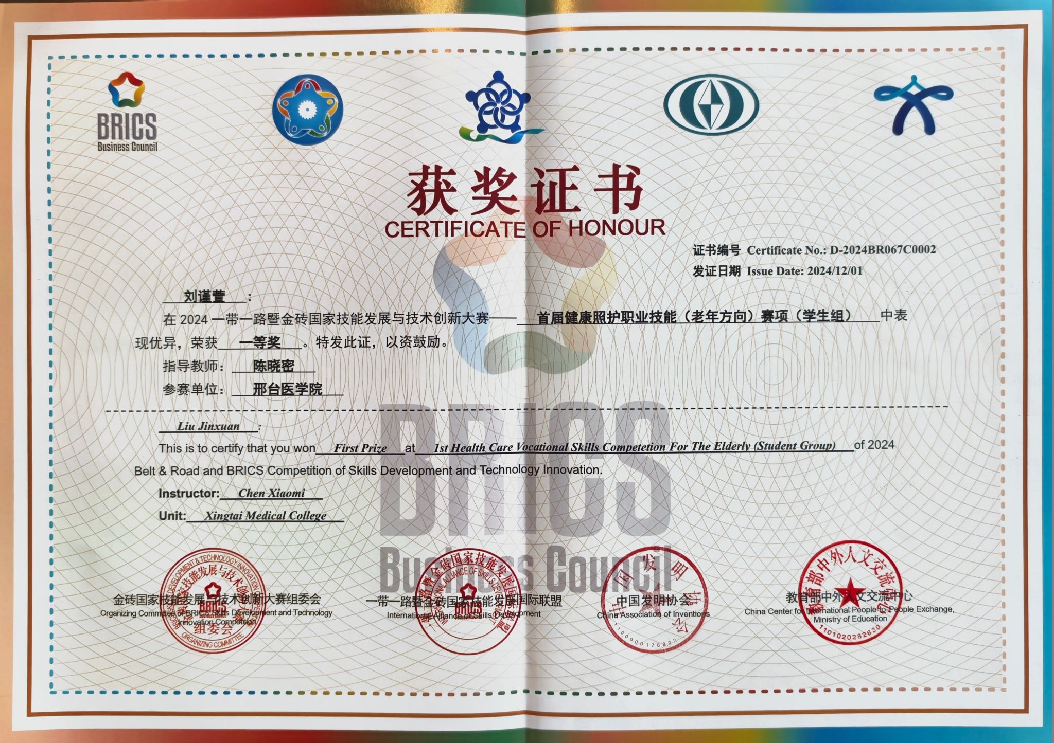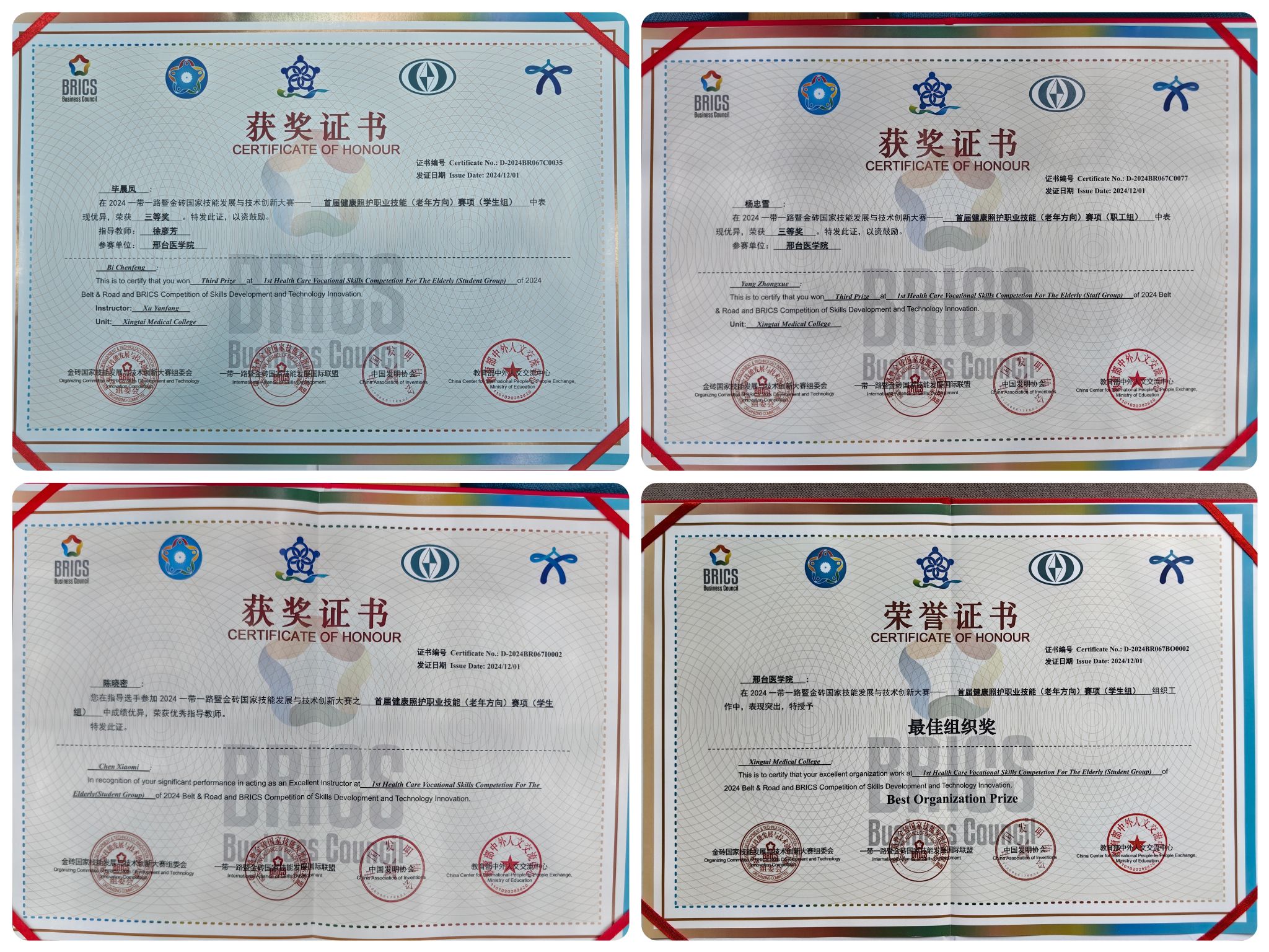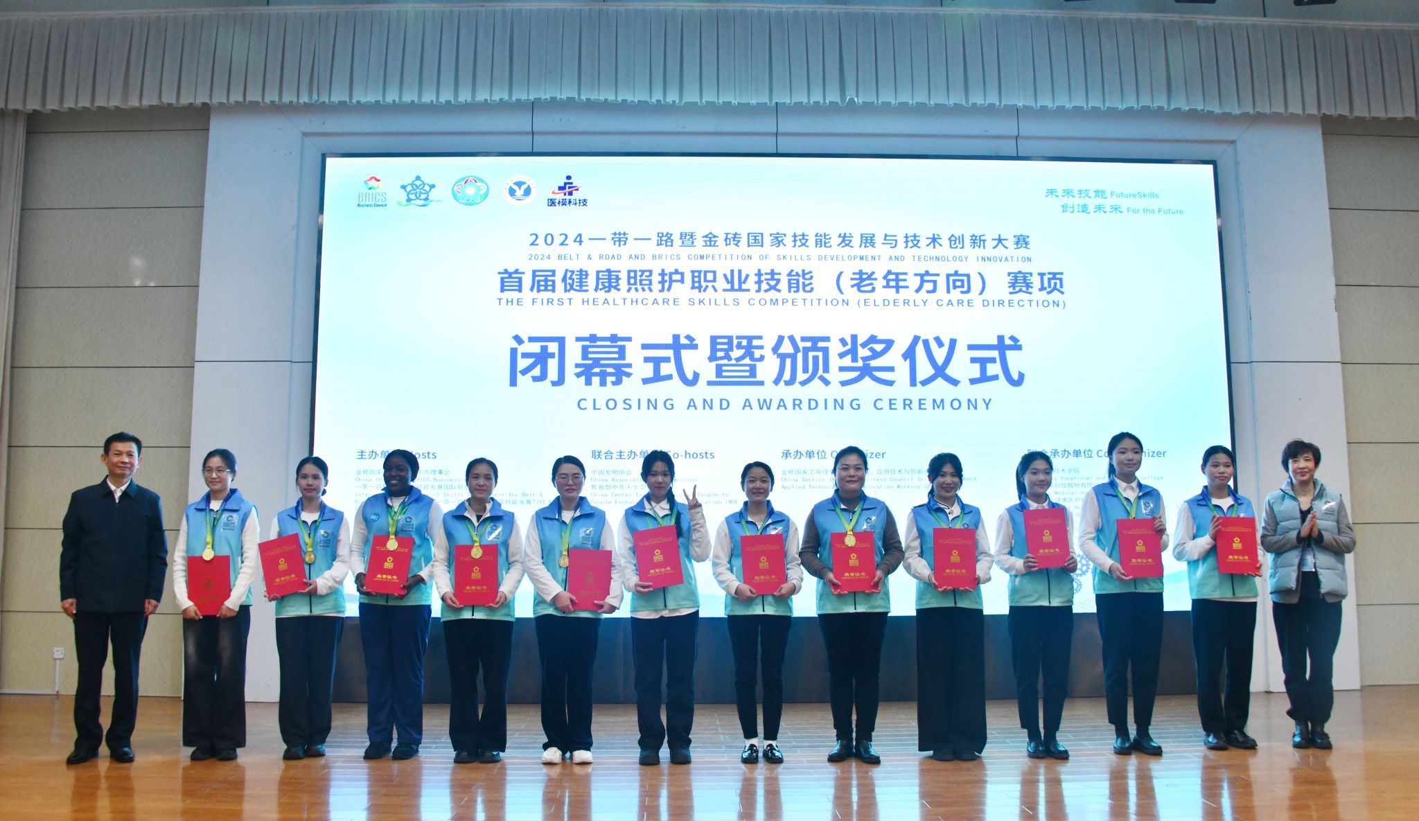 本次大赛由金砖国家工商理事会中方理事会、一带一路暨金砖国家技能发展国际联盟、中国科协“一带一路”暨金砖国家技能发展与技术创新培训中心主办,于11月28日至12月1日在聊城职业技术学院举行,共设学生组、职工组、国际组三个组别,吸引了来自国内外110支代表队的263名选手参加。比赛中,beat365官网代表队沉着应战、奋勇拼搏,取得了优异成绩,充分展现了beat365官网在健康照护领域的专业实力和人才培养水平。
