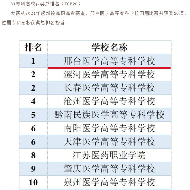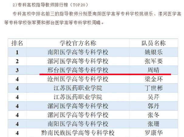 近日,全国大学生基础医学创新研究暨实验设计论坛(大赛)组委会发布了近十届大赛分析报告,自2021年增设高职高专赛道以来,beat365官网在四届比赛中共获奖20项(5金、10银、5铜),在该赛道参赛院校中排名榜首,学校连续四年获优秀组织奖,基础医学部教师周晴在专科高校指导教师排行榜(TOP20)中排名第三。