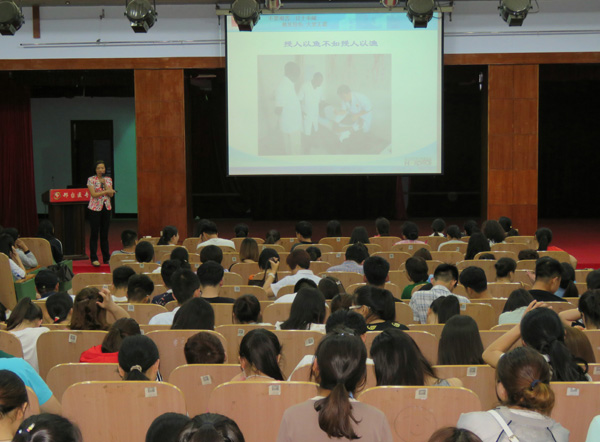 张瑞琴主任以“大爱无疆”为题,用质朴的语言、真挚的感情、鲜活的事例,饱含深情地为师生讲述了医疗队员们两年来不畏艰苦、甘于奉献、救死扶伤、大爱无疆的工作点滴和心路历程。她从“医疗队的历史、刚果(金)的概况、埃博拉疫情的凶险、面对复杂多变的政治局势时医疗队的艰险和困难”等方面,讲述了在条件艰苦的异国他乡,医疗队全体队员以坚忍不拔的毅力,克服了基础设施不足、医疗条件落后、传染病风险等一个又一个困难,以及对家国的思念、与至亲生死离别的情感挑战,创造了一个又一个奇迹,谱写了一个又一个感人至深的故事,得到受援国和国际社会的高度评价。“在刚果(金)有中国人的地方,鲜艳的五星红旗始终高高飘扬!”“刚果(金)政局动荡时,医疗队也遭受了冲击。面对骚乱,我们的心是坚定的,没有一丝恐慌,因为我们背后是伟大祖国!”他们以实际行动诠释了对“国家”这两个字的理解,用历经磨难和挫折之后的果敢践行了对祖国的忠诚。一句句平实的叙述掷地有声,汇聚成爱国洪流在师生心中激荡!“下乡抗病治病、送医送药、普及健康的同时,我们更注重开展医疗技术培训,为的是留下一支带不走的医疗队。”这是援非英雄忠诚医疗事业和坚守职业道德的信念体现,展现了中国医务工作者恪守宗旨、救死扶伤,尊重生命、崇尚医德的职业精神和强烈的使命感、责任感。整场报告内容丰富、情真意切、感人至深、催人奋进,用先进的事迹唱响了奉献主旋律,用榜样的力量传递了道德正能量,医疗队员们扣人心弦、感人肺腑的经历深深吸引感染了师生,赢得了经久不息的掌声。