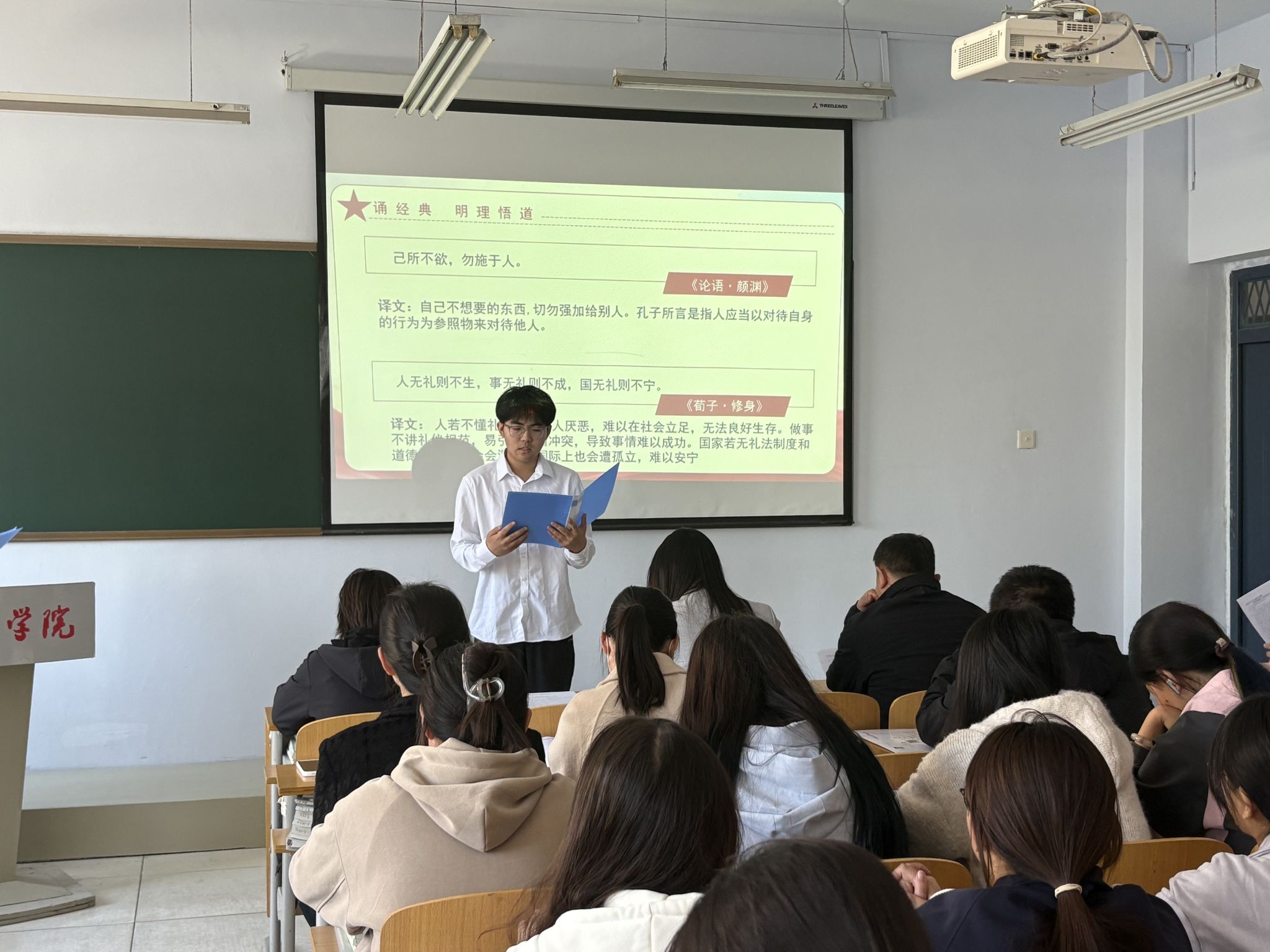 在诵经典环节,各讲堂分别诵读了《礼记·礼运》《古今医统大全》《荀子·修身》《论语·颜渊》《大医精诚》等文章,汲取传统文化精髓,弘扬传统道德风尚,引导师生积极践行文明理念,为构建和谐社会、文明校园贡献力量。