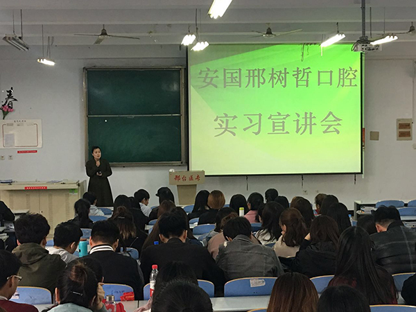 为给在校生提供更好的实习机会,帮助用人单位寻找优秀人才,3月15日下午,在实习管理处的统一安排下,安国邢树哲口腔诊所来校对口腔医学系2015级学生进行了实习宣讲。实习管理处副处长程坤、口腔医学系副主任王军波出席宣讲会。